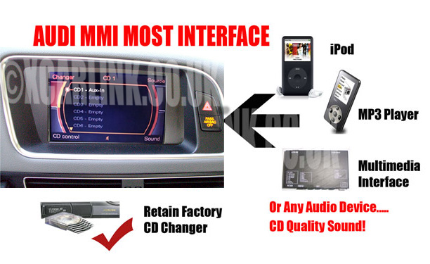 This interface is specifically designed to allow connection of an external audio source to the 2G MMI systems with the highest quality sound. It connects directly to the fiber optic connection on the back of the CD changer and then allows you to connect any audio device such Smartphone, MP3 player, iPod, DVD etc through the AUX in connection. The interface is fully plug and play, and also retains the original CD changer if present. Features