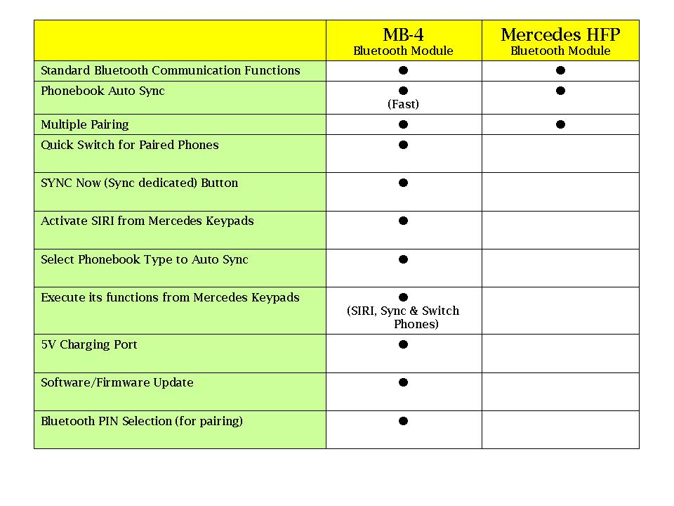of a button. Compatible with all Mercedes Benz models with the UHI (or MHI) connector. This is usually found in the arm rest of 2005 onwards Mercedes but may be present in earlier 2003-2004 models too. The MB-4 simply connects directly to your car without the need for a Nokia cradle. Requires no installation - simply plug and play! Classic features Like its predecessor, the MB-2 Bluetooth upgrade